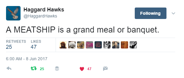 If you don’t already — please go and follow @HaggardHawks on twitter, and sign up to the newsletter. You’ll have your feed peppered with wonderful snips of language, such as: