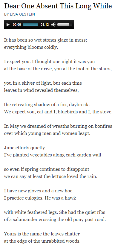 I have a bit of a softness in me for the re-articulated pastoral. The kind of things that would put me off usually, are nicely undercut — the companionship of animals undercut with the companionship of the stove and odd twists in the language like “June efforts quietly” and “unrabbited woods”.