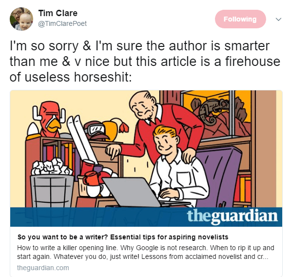 More annoying for me is the fetishization of the difficult labour of writing throughout the piece, the language of it suggesting that there’s little between, say, building a house and writing a novel. I am sure Colum McCann is an excellent writer and tutor, but I think this might have been written with a low-hanging deadline.