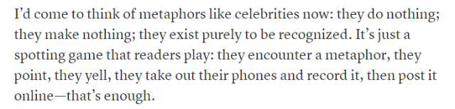 When it comes to owning a thing, nothing really beats owning your own space. Except when that ownership is a form of oppression for others. In this article in the baffler, the concept of ownership is discussed, as well as a powerful case put for the death of the metaphor. In a sense, is there any sense in making metaphor ion the world can offer you only uncertainty and misunderstanding — after all, isn’t the silent agreement of metaphor that we understand the world in a shared way, that that metaphors are a show cast by or against it?