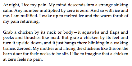 This week we have Eula Biss’s prose-poem-essay on pain, called The Pain Scale, which you can find a direct link to here.