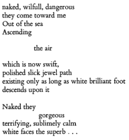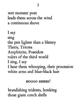 The whole poem can be read here. The poem is about the invocation, the desire of a poet to bring forth a god to appear in front of him. The first and second verses are about his frustrations, his desperation to make something happen with his word. He’s in the right place, by the sea shouting for deities who represent the deep. And they arrive, in procession — undercut by a conch-honk.