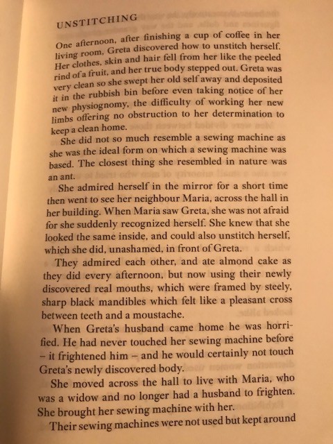 Aside from the powers that loom over the protagonists of the collection — there are the returning themes of women finding a kind of self, comfort, truth, or form. Like in the opening story, Unstitiching: