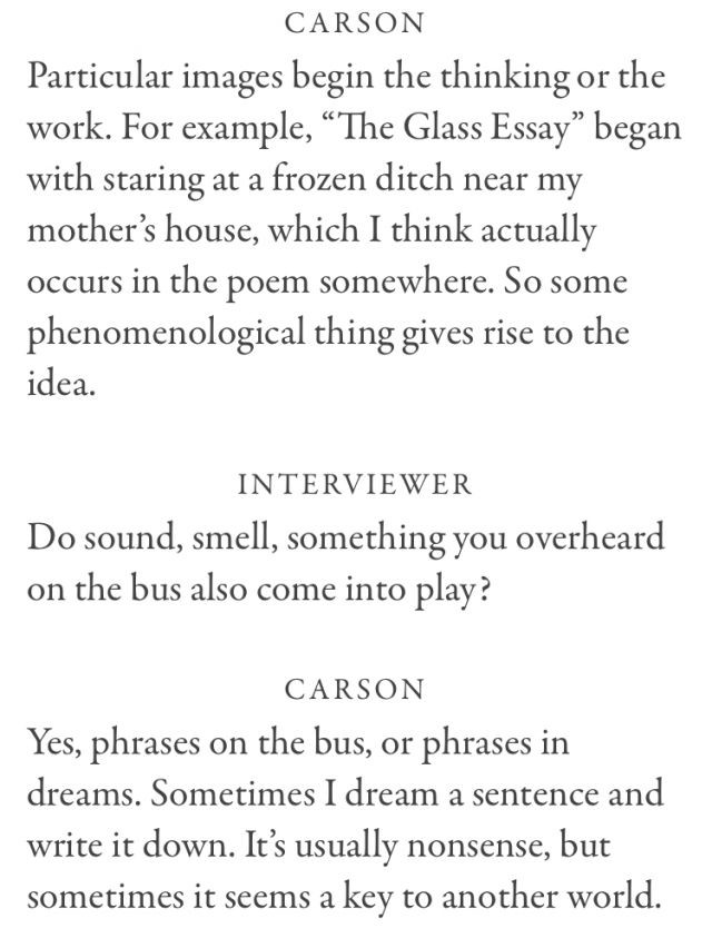 Very kindly, Santa slipped a Paris Review subscription down my chimney this year. Which means I was able to read the entirety of their Art Of Poetry piece with Anne Carson.