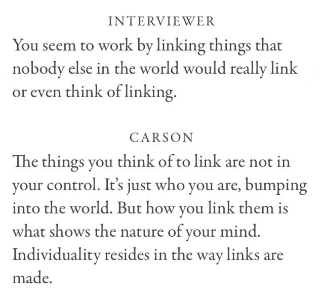 I love this way of working, as it pushes against so much of the writing advice that comes from the majority of the writing community. There’s usually talk of tidy desks, a space, avoiding distraction — but Carson’s way of working suggests just a life of nibbling away at things while whirling on the outskirts of a vortex, lazily reaching out to make a mark here, or add something relevant there. It’s a very pure way of working that suggests that there is no compromise in the things she produces, as anything that is produced at that time will be effected by everything else produced at that time.