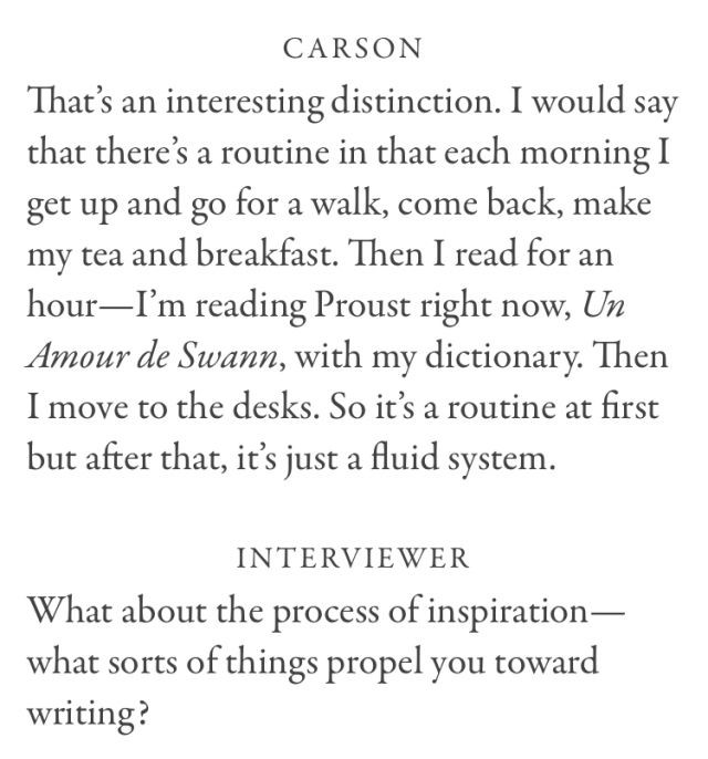 Some interesting parts, aside from the moment where Carson suggests she calls herself evil to shock herself into some better thinking, they discuss her writing practice — which includes a scatty undisciplined darting between three desks she has set up in her studio.