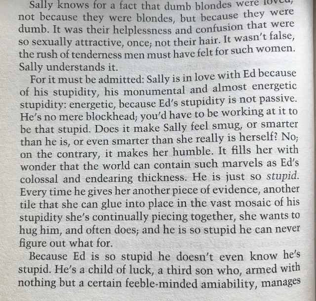 It’s interesting to compare this to some of Atwood’s later work, like the MaddAddam trilogy, where some men retain this structural connection, but increasingly the theme is that there are “good ones” in the destruction of those structures. Not that the men in this later work aren’t difficult in their own way, but they’re not as obviously meshed into a power structure that’s in any way malleable.