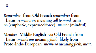 The first verse tells us that the books were for storing themselves, because they had their words stolen from them by some unnamed event. This idea of books as stored external knowledge, but for a person, is mixed through the redefinition of “remember” and “member” down from calling to mind (with force) through to flesh, meat — and to the third verse of the memories hands/bodies hold.