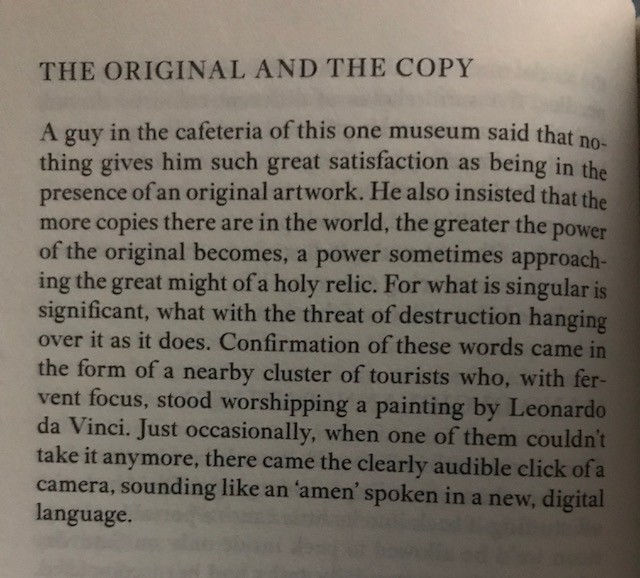 It’s obvious why I like it. It’s a constant roll of self-sufficient references, constantly setting out ideas and then returning to them from a slightly different angle. We move through the body, psychology of travel, and snippets of overheard and directly extracted philosophy. Like this, on copies: