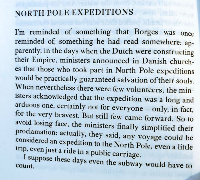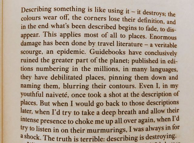 and then moving on through a few short stories of being laid over at an airport voluntarily and meeting a woman collecting an exhaustive list of the world’s infamy’s, the unreality of maps, guidebooks, places that you expunge from reality because inelegancies or trauma occurred (but never telling the people who live there, who might find it upsetting).