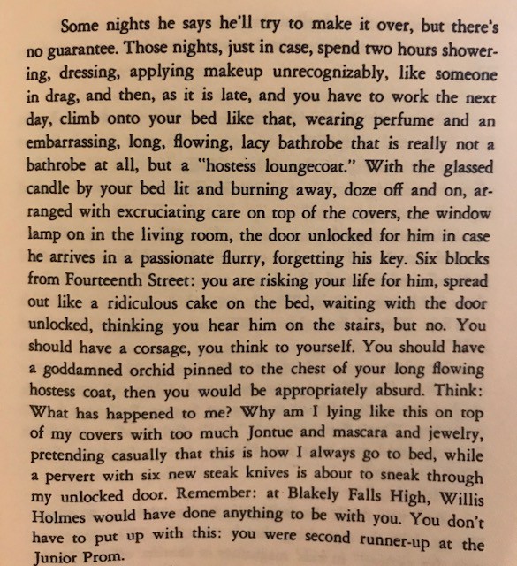 She refers to herself as a “ridiculous cake” when describing how she is made up to go to bed on the chance that he might arrive. She turned herself into objects often to make the self less real. She has to develop the idea by trying out the reality — I suppose here being The Woman — and then slipping it and flipping it into another shape that seems more appropriate to what she believes she is becoming.