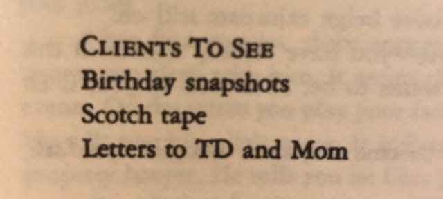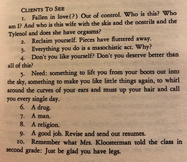 This identity by reflection comes from the protagonist constantly punning away from the central language of her counterpart. When she discovers that the wife of the man she is seeing makes lists, and that this is something he likes about her, she begins producing them as part of her narrative identity as an other woman: