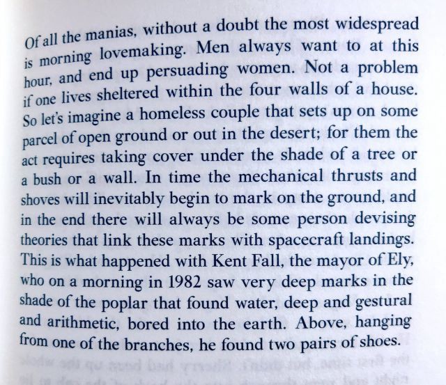 The narrative is a sprawling, branching even, set of vignettes or prose poems, set around the poplar that found water in the Nevada desert. The tree, nearly halfway along the stretch of road which contains nothing at all and is bookended by a brothel on either end, is one that people stop at to throw their trainers over. Or pass by in an attempt to circumnavigate the globe, or make love under, pass in a hurry or lose your briefcase full of found pictures beside.
