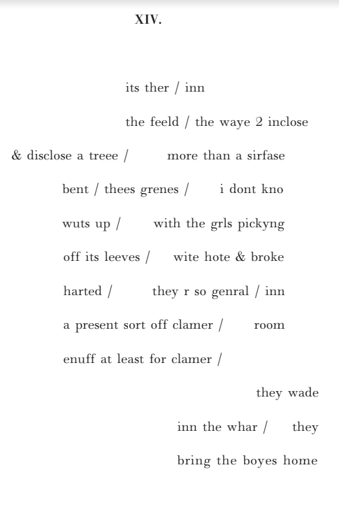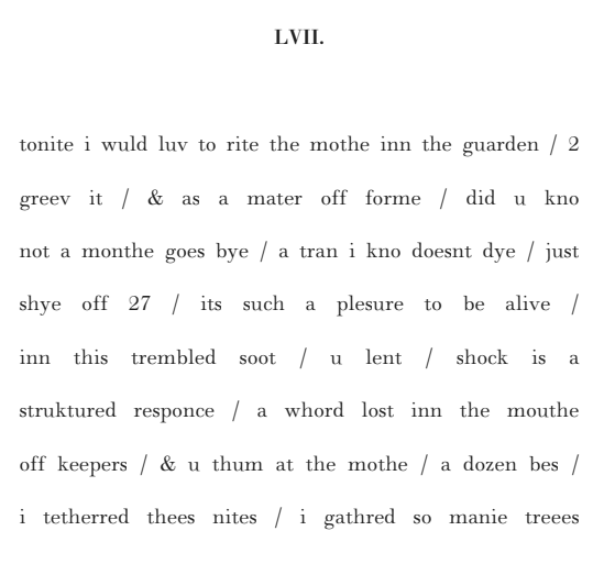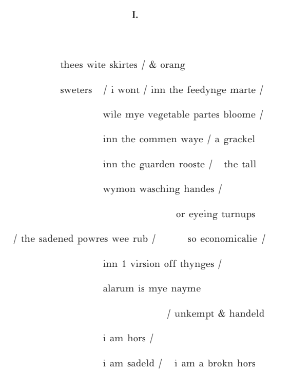Still, in the same way that anyone can read Chaucer if they relax the part of their brain containing what they think are the rules (read: what they were told as a child was correct) and read aloud, the same can be said for feeld. The effect is one which presents conflict between the childishness of it — and the associated authority with have with old English. It jars forming a neat set of double meanings (deer/dear, the field/a past tense to have felt) and produces a similar effect to the content of the poems themselves — that of balancing the past with the current, authorial reading.