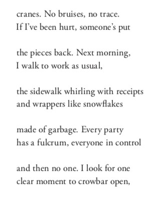 This is a keystone poem to the collection, one that in some ways lays out that desire for completeness. These poems are compared to murder stories, she suggests she is not asking the reader to do all that much leaping as there are no gaps — unlike Sappho there’s neither the smudged lines of desire or the fragmenting for interpretation. There’s no shying away from the truth of it all — there’s no hiding details about real life. We hear of friends on drugs, of family members navigating fear with children, and her own childlessness.