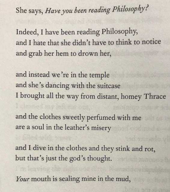 And this is mixed in with classical references. The posed question of how time feels to Atlas — a man with a big burden might see it as unimportant. He looks instead at the sheep devouring the sweating plants — so much effort into giving life, to be eaten by one another. Delphi is asked not what the gods think, but what she thinks, in a flirtation.