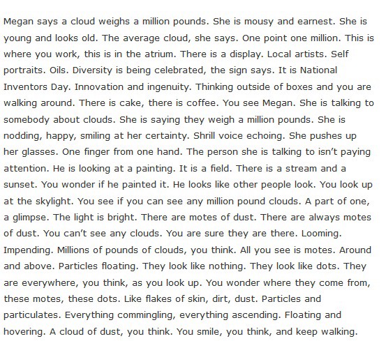 I enjoy the swirl of images, the repetition, and the normalcy of it. There’s humanity and warmth in its distractedness; “The person she is talking to isn’t paying attention” and “He looks like other people look” put us no closer to the grit of the scene but place us entirely within its feeling. There’s a fun juxtaposition that waltzes back and forth of the sublime idea of heavy clouds, then only being able to see gathering dust — despite trusting that there are heavy clouds — and then that all dust is just people swelling together into sublime heavy clouds.