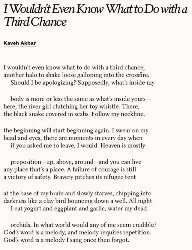 A slightly unshared poem by Kaveh Akbar from earlier in the year (with thanks to Ben Read): I Wouldn’t Even Know What To Do With A Third Chance is a poem about the graceful losing grace, it contains the assumption of having had grace to start with and knowing its shape at all.
