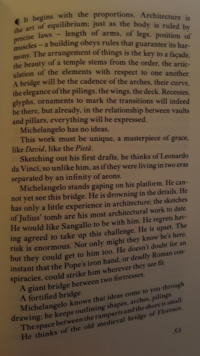 The sculptor feels rejected by the pope and overlooked by his people — so takes a journey that could be considered treasonous in order to fulfil this brief. He makes notes, lists of objects, descriptions and movements. This listing of the passive visible objects are part of the metaphor for his struggle to realise the bridge he has been enlisted to build and his inability to possess a dancer he has taken a fancy to. This is mirrored in his poet companion, who falls in love with him, and is unable to see him as an unpossessable object. And Michelangelo is the same in viewing himself — as much as his life is rich and full, he becomes a statue himself when approached by beauty.