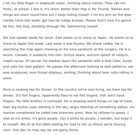 It’s easy to see how this story could spin out into everything else. I think that’s what I like most about flash fiction, the suggestion that there is more — a connecting cosmos of people, feeling and moment. Here we are helped with the idea of travel and sense of not having a home — a doctor with desires to always move on whose child always gets bruised.