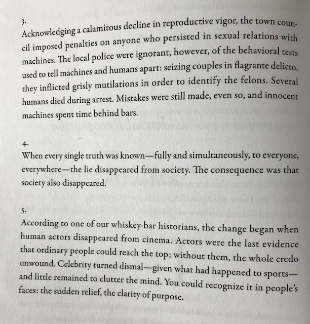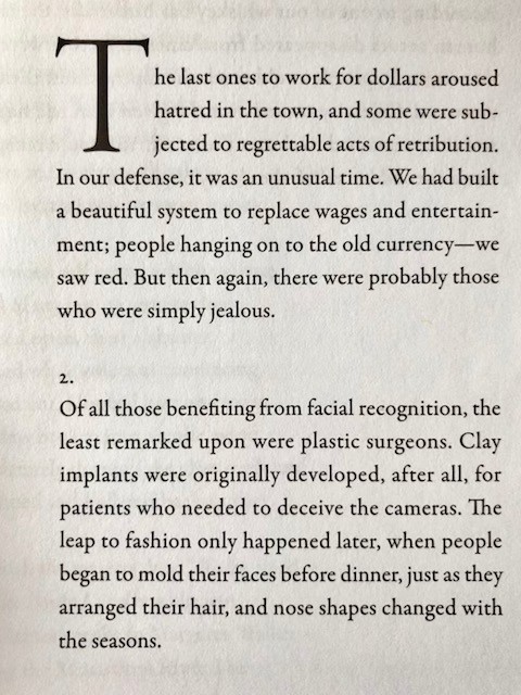 Later there is a discussion about zeros, there is a man whose jobs is the zeros — you can’t put one in until you take one out. This idea of displacing nothing with nothing, and that it is a labour, expresses an idea of an afterlife that can only be partially gratifying for the living.