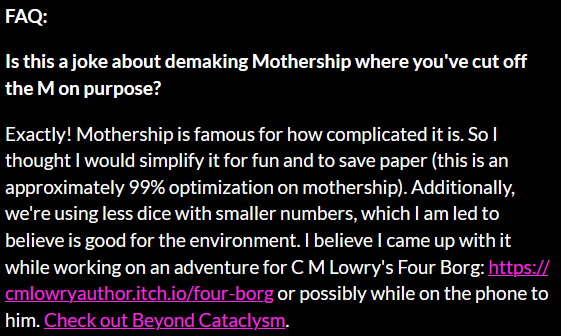 The second game is an OSE solo procedure that riffs on the Dark Fort game which MORK BORG is based off. In Dark Fort, you would roll dice to see how many exits there are to the next room, and then do an encounter if relevant. It’s a very simple and satisfying crawl experience. A napkin’s worth of adventure. I’ve created a version of this for OSE which reference pages in the various books of the manuals for the game. With the procedure players will be exploring and mapping out a weird dungeon as they explore it. They’ll discover the denizens of each level as they descend and deal with encounters as if their party was being run by a real GM. It’s a simple system with loads of discovery in it, while staying as close to the vanilla OSE rules as possible. I’ve got an idea to print it at a size where it’s just a bit slimmer than the OSE books so that it can slip inside the front cover without poking out. Maybe this is how all solo modules should be? I’ll likely do a swift and low-target kickstarter for this just for the print run.