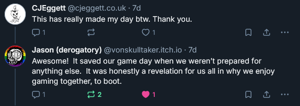 The game is a solo ‘idle game’ experience where forgetting about the game (in the same way you forget your coffee and let it go cold) is part of playing it. Create a character, set them off on adventure and record their attempting action or goal. And then – the next time you have a sip of your coffee – you check the oracle and various table to see how things went, before creating their next step. It’s ben interesting as there’s some ethical concerns around how you make someone drinking or not drinking coffee a success variable. You obviously don’t want to encourage people to chug away at their coffee or drink more than they need or want to. As such success can’t be ‘scold yourself with nuclear strength caffeine water’.